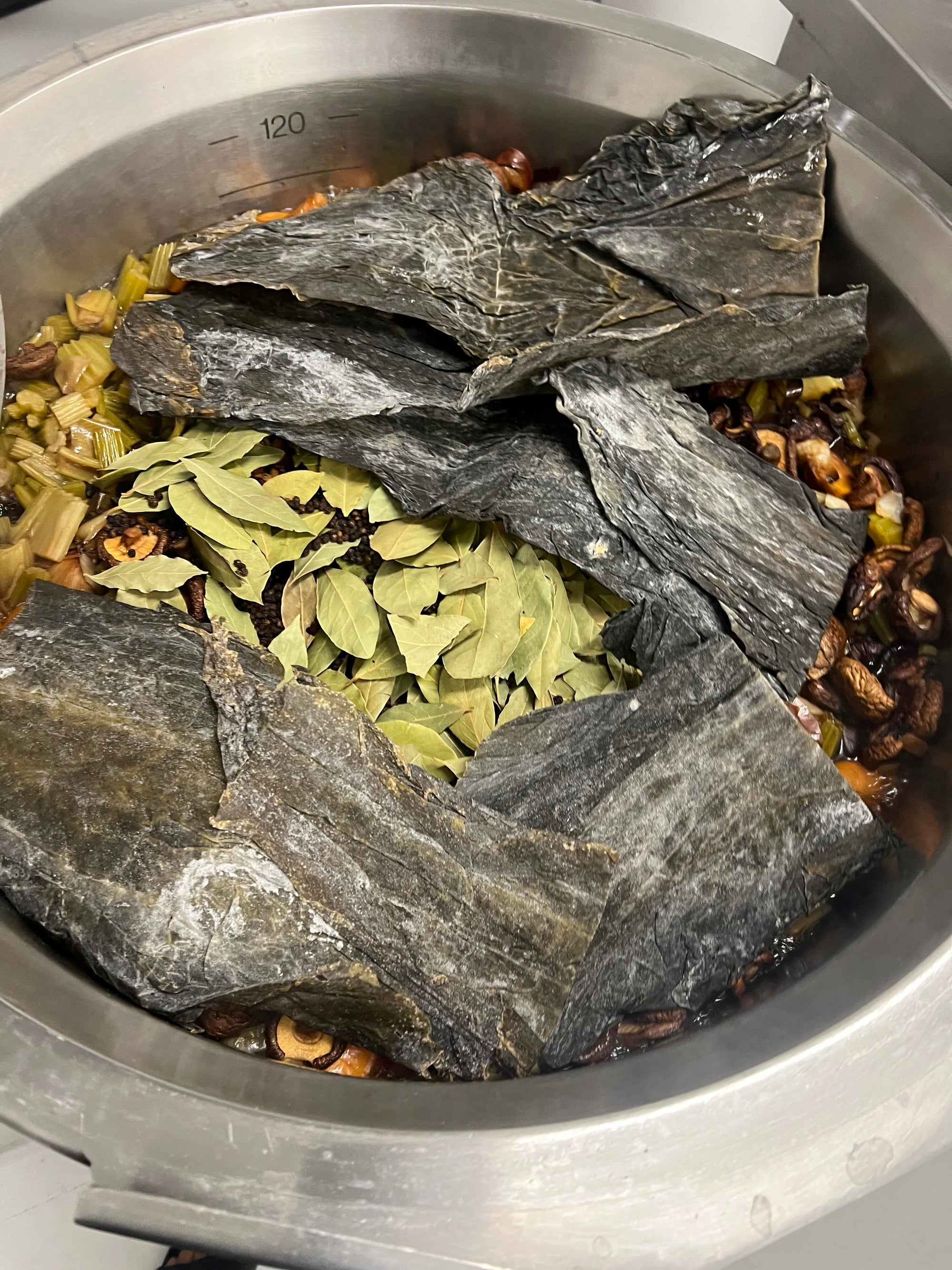 Collagen broth is a long-cooked broth of bones, vegetables and herbs.